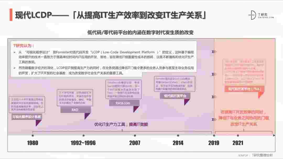 2020年前后,,,,源于提高IT工作者开发效能的LCDP不断进化和衍生,,面对业务导向日益明显的数字化变革。。。LCDP衍生出了面向不同对象的升级服务——面向专业人群的LCDP和业务人群的NCDP,,,,LCDP与NCDP的不同服务属性被逐渐认可和接受。。。 LCDP在提高IT开发效率的同时,,,,降低IT与业务之间协同的门槛改变IT生产关系。。。