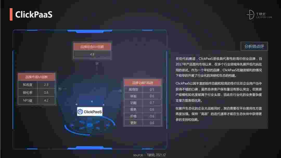 T研究认为,,在低代码赛道,,NO钱包是极具代表性的海归创业品牌,,,自2017年产品面向市场以来,,,,在多个行业领域率先展开低代码应用的尝试。。。。作为一个年轻的品牌,,,,NO钱包较早的开展了行业化的深耕和生态的构建。。。。NO钱包以丰富的组件功能和较高的性价比在企业用户当中获得不错的口碑,,,,在客户规模和知名度都属于行业头部,,,,因此在行业化的业务复杂度支撑方面表现优异。。。。